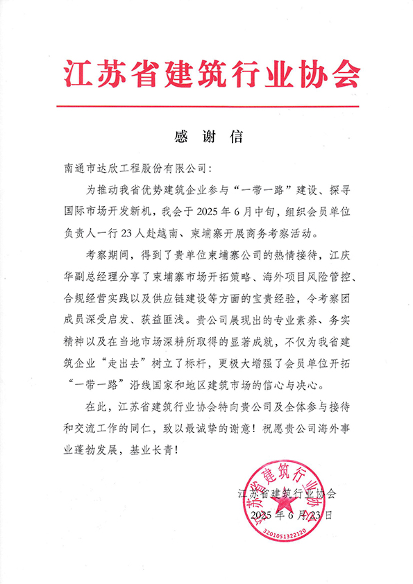 6月23日,集團收到來自江蘇省建筑行業協會的感謝信。信中對集團柬埔寨公司在省協會組織會員單位赴柬埔寨商務考察期間,以專業實力與豐富的實踐為考察團提供有益的幫助,特此專函致謝。